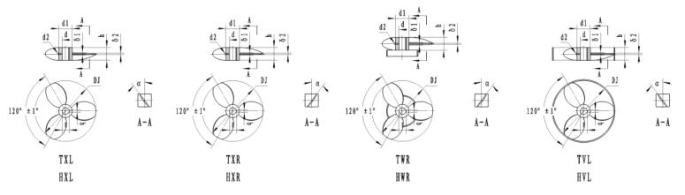 75、三葉左旋導流筒推進式TVL       76、三葉右旋推進式TXR