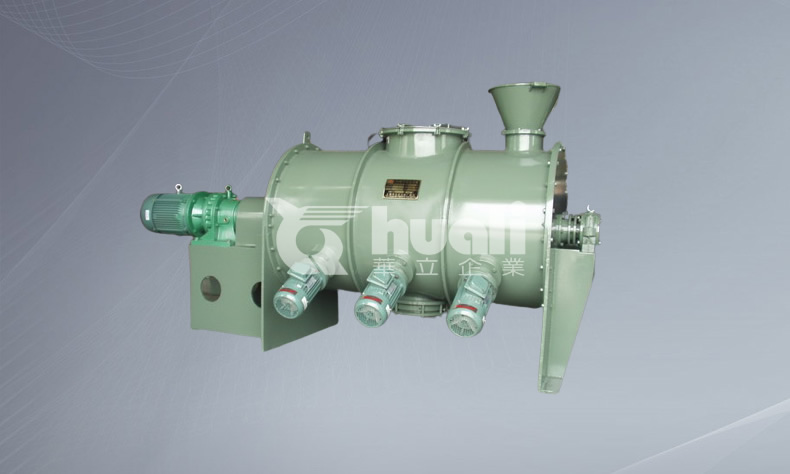 混合機開動后犁刀繞軸旋轉,帶動物料沿筒體徑向作周向湍動,同時把物料沿犁刀兩側面的法線方向拋出。當被拋出和作周向湍動的物料流經飛刀組時,被高速旋轉的飛刀迅速、有力地拋散。物料在上述犁刀和飛刀的復合作用下,不斷更換、擴散、在較短時間內達到均勻混合,混合精度較高。對需要固-液混合的物料,混合液體通過噴液裝置均勻噴灑在筒體內運動的物料上。